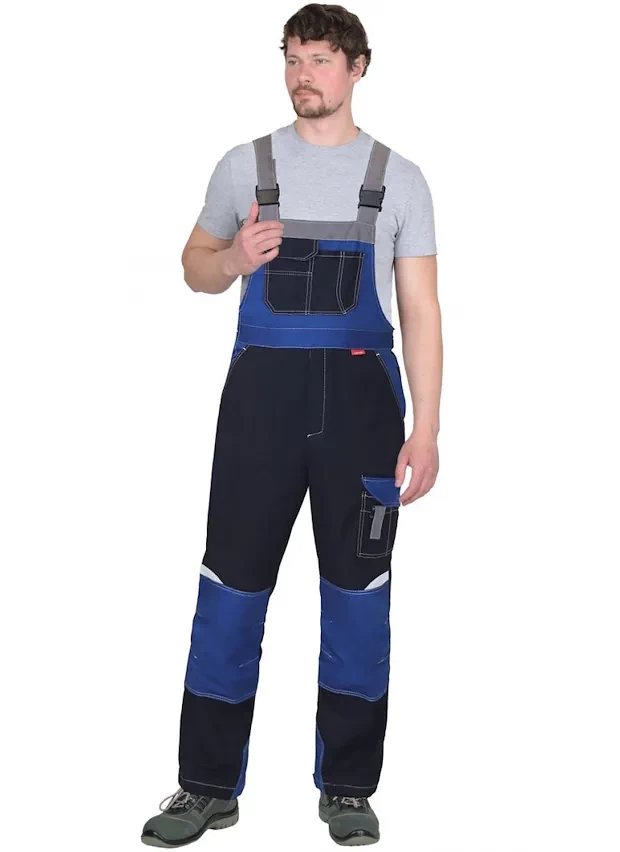 Полукомбинезон с застёжкой гульфика на молнию и застёжкой в боковом шве на пуговицы. Верхние накладные карманы с клапаном, нижние внутренние боковые карманы, на задней правой половинке карманы для инструмента, также предусмотрена шлёвка для инструмента.